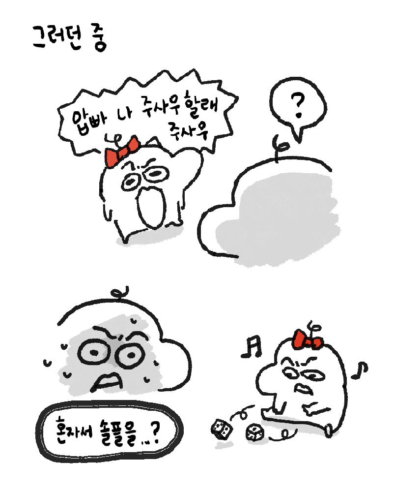 잘 안 가지고 노는 보드게임을 아이한테 건네주고 그냥 장난감처럼 가지고 놀게 했었는데, 어느 순간부터 점점 제대로 가지고 노는 모습을 발견해서 놀람.